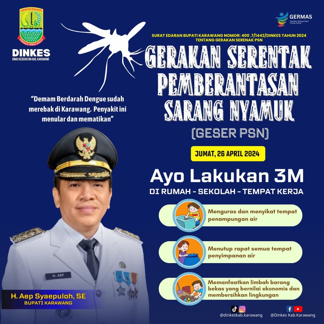 Hal itu langsung di Instruksikan oleh Bupati Karawang melalui surat Gerakan Serentak PSN melalui Dinas Kesehatan Karawang yang di tujukan kepada kepala OPD Pemda Karawang, Camat, Lurah dan Kades juga para kepala sekolah.