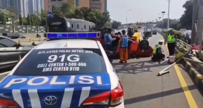 Mendadak, mobil yang dikendarainya menabrak pembatas jalan hingga terbalik.