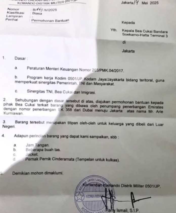 Jakarta, bukaberita.co.id — Sebuah surat dari Komando Distrik Militer (Kodim) 0501 Jakarta Pusat kepada Kepala Bea Cukai Bandara Soekarno-Hatta Terminal 3, Gatot Sugeng Wibowo, menarik perhatian publik. Dalam surat bernomor B/169/V/2025 yang Komandan Kodim 0501/JP, yang Kolonel Inf Harry Ismail tanda tangani pada 14 Mei 2025, pihak militer meminta bantuan meloloskan barang bawaan penumpang atas nama Arie Kurniawan.