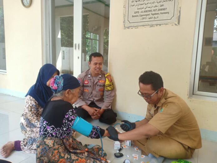 Bahkan, Bhabinkamtibmas Polsek Tegalwaru Aiptu Deden Suryana pun mengikuti Cek Kesehatan Gratis yang di besut oleh Tenaga Kesehatan dari Puskesmas Loji.