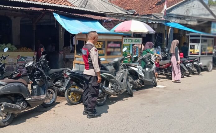 Intensif, jajaran personil Polsek Tegalwaru giat patroli siang dan monitoring areal parkir kendaraan roda dua yang ada di wilayah pasar tradisional Loji.