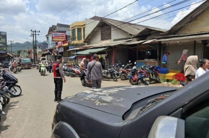 Personil Polsek Tegalwaru melaksanakan pengaturan lalu lintas juga edukasi petugas parkir dari Linmas Desa Cintalaksana agar waspada.