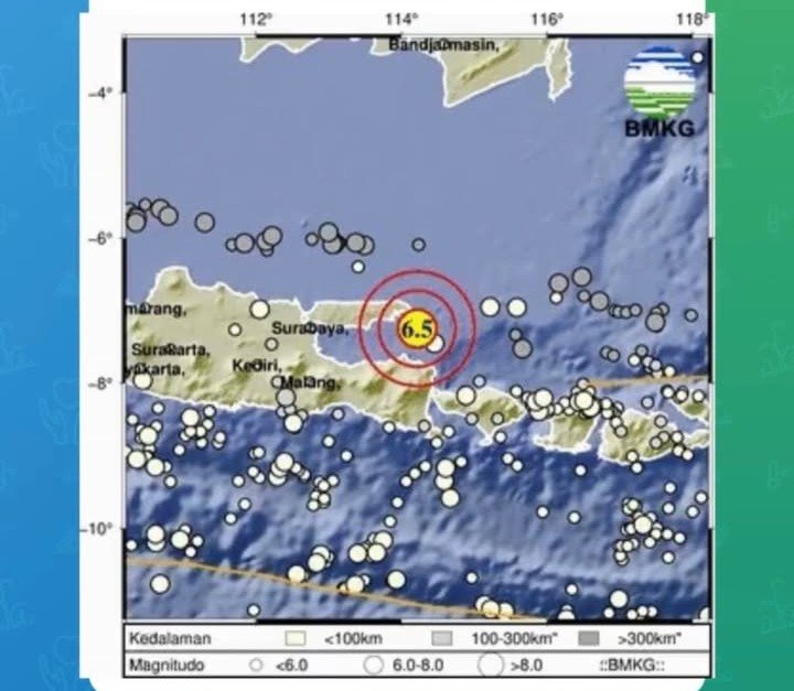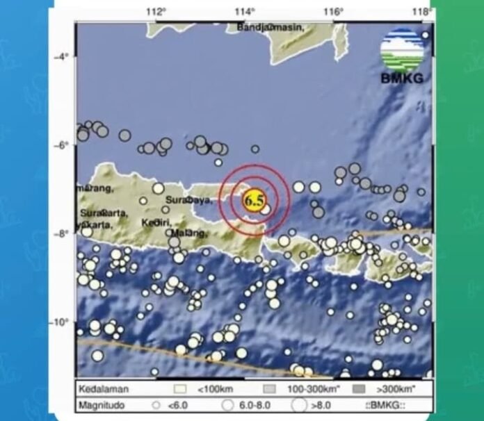 Jawa Timur, bukaberita.co.id – Badan Meteorologi, Klimatologi, dan Geofisika (BMKG) mencatat gempa berkekuatan magnitudo 6,5 mengguncang tenggara Kabupaten Sumenep pada Senin (30/9/2025) pukul 23.49 WIB. Episentrum gempa berada di laut pada koordinat 7,25 LS dan 114,22 BT atau sekitar 50 kilometer dari Sumenep, dengan kedalaman 11 kilometer.