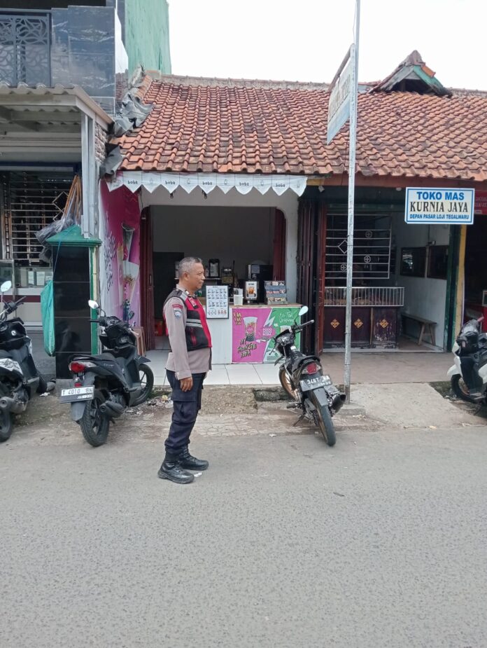 Intensif, jajaran personil Polsek Tegalwaru giat patroli siang dan monitoring areal parkir kendaraan roda dua yang ada di wilayah pasar tradisional Loji.