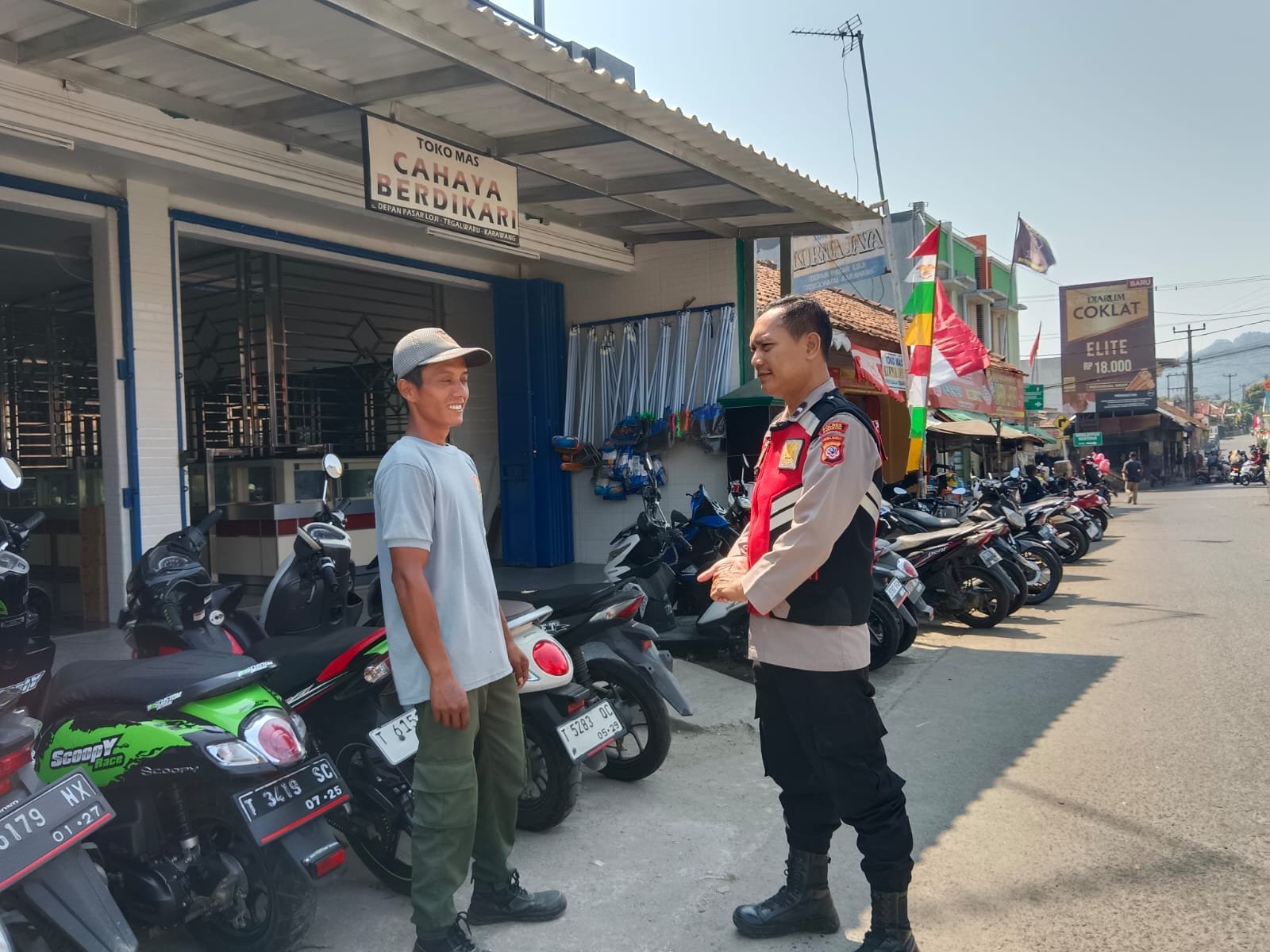 Intensif, jajaran personil Polsek Tegalwaru giat patroli siang dan monitoring areal parkir kendaraan roda dua yang ada di wilayah pasar tradisional Loji.
