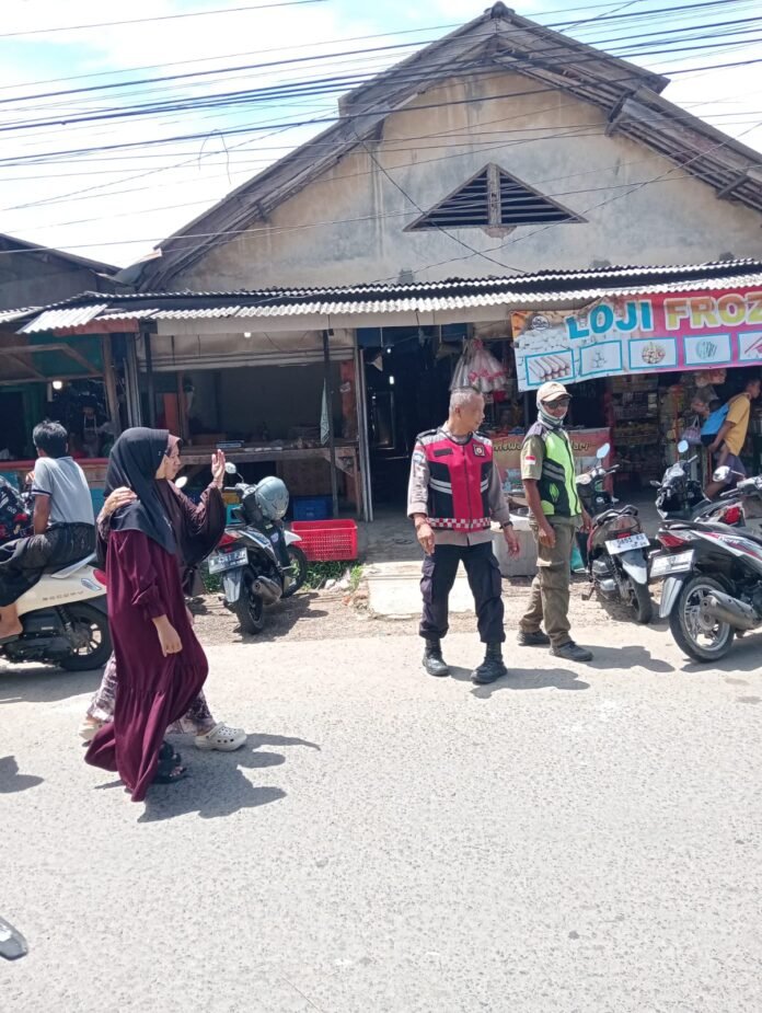 Intensif, jajaran personil Polsek Tegalwaru giat patroli siang dan monitoring areal parkir kendaraan roda dua yang ada di wilayah pasar tradisional Loji.
