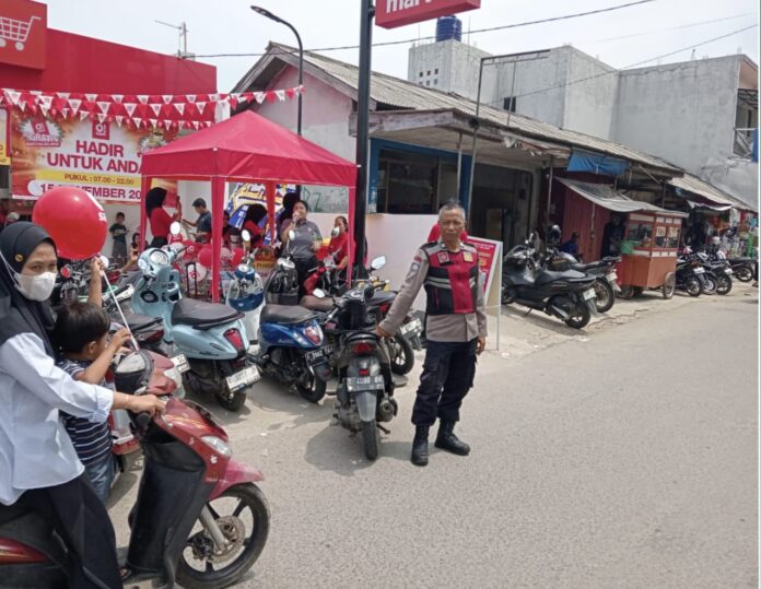Intensif, jajaran personil Polsek Tegalwaru giat patroli siang dan monitoring areal parkir kendaraan roda dua yang ada di sebuah minimarket Oi Save Loji.