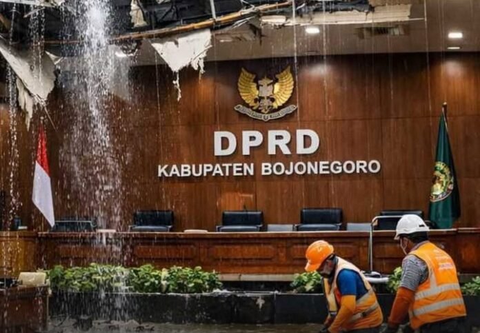 Bojonegoro, bukaberita.co.id – Hujan deras yang disertai angin kencang menyebabkan plafon ruang sidang paripurna Gedung DPRD Bojonegoro ambruk pada Selasa (23/12/2025) petang. Air hujan pun masuk ke dalam ruangan dan menggenangi area sidang, meski tidak menimbulkan korban jiwa.