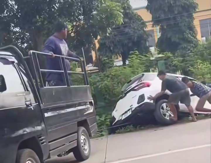 Situasi sempat kembali menegangkan saat proses evakuasi kendaraan berlangsung. Mobil yang ditarik keluar dari selokan diketahui tidak memiliki pengemudi di dalamnya sehingga tidak dapat mengerem.