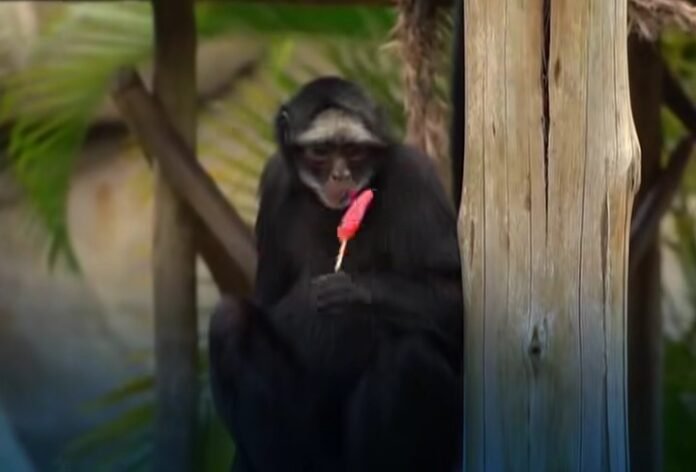 Pemandangan menarik terlihat ketika beberapa monyet tampak lahap menikmati es loli semangka. Sementara itu, seekor jaguar terlihat berusaha mengambil es loli berbahan daging ayam giling dari nampan yang penjaga siapkan.