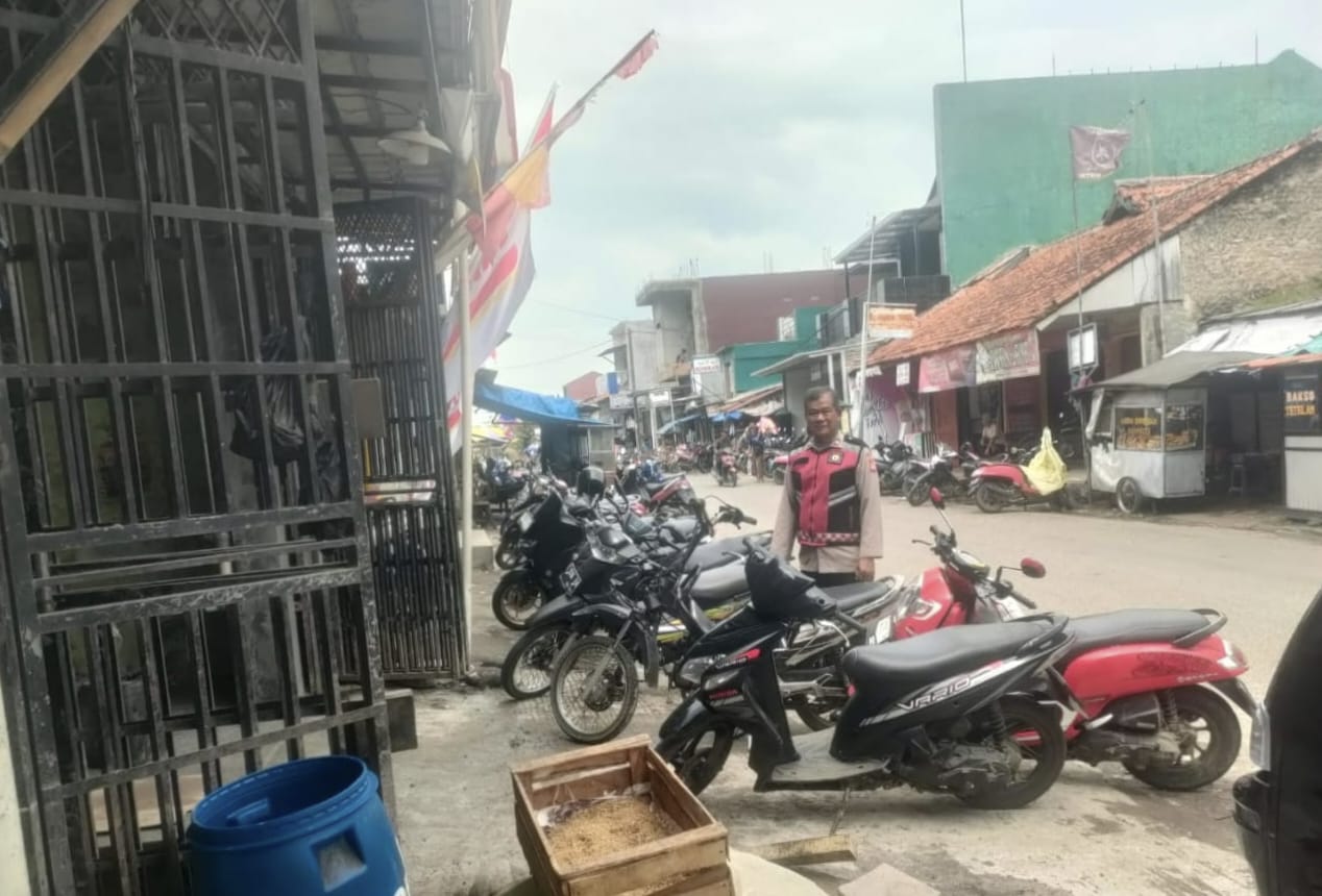 Berlangsung di pasar tradisional Loji, personil Polsek Tegalwaru monitoring aktivitas masyarakat dan melakukan pencegahan pencurian kendaraan bermotor di areal parkir pasar itu.
