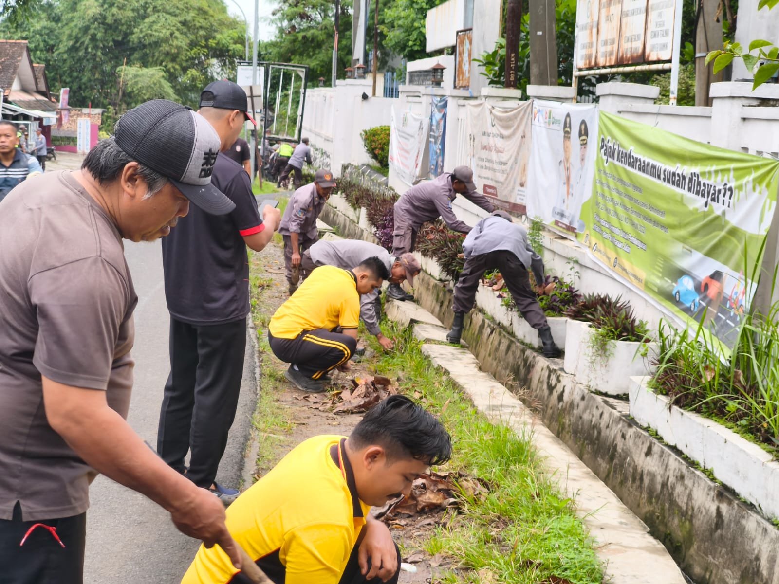 Terlihat kompak, membersihkan sampah sampah dan rerumputan juga ranting-ranting pohon yang menjuntai ke jalan di bersihkan.