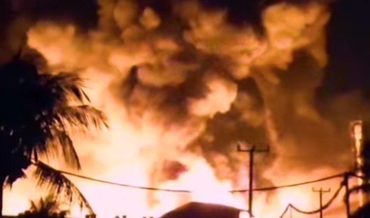 Sejumlah saksi mengaku mendengar beberapa kali ledakan sebelum api membesar dan menjalar ke gudang penyimpanan sagu. Kobaran api juga membakar satu unit forklift yang berada di area tersebut.