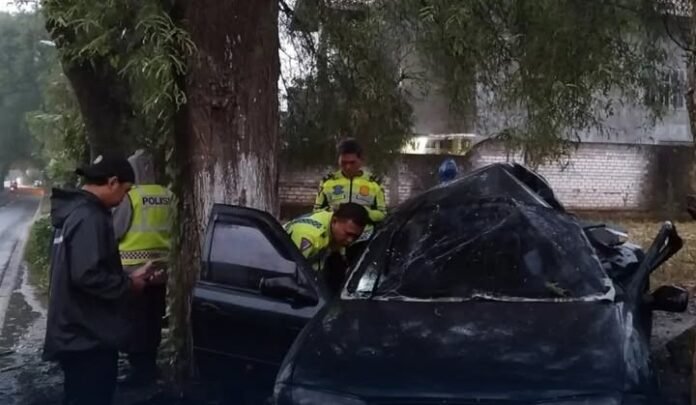 Berdasarkan informasi awal, setibanya di lokasi kejadian kendaraan diduga mengalami selip dan oleng ke arah kanan. Pengemudi kehilangan kendali hingga mobil menghantam pohon di tepi jalan dengan keras. Akibat benturan tersebut, kondisi kendaraan mengalami kerusakan parah.