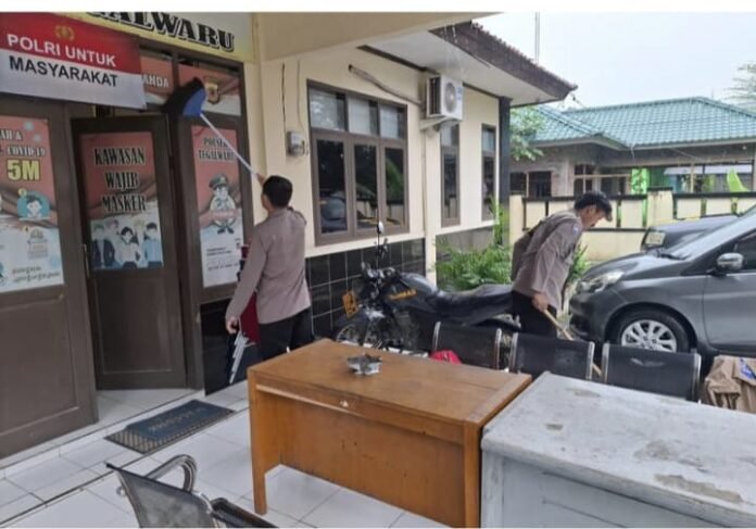 Proses bersih-bersih itu di mulai ruang depan kantor, saluran air, sel tahanan hingga ruang ruang belakang mako Polsek Tegalwaru.