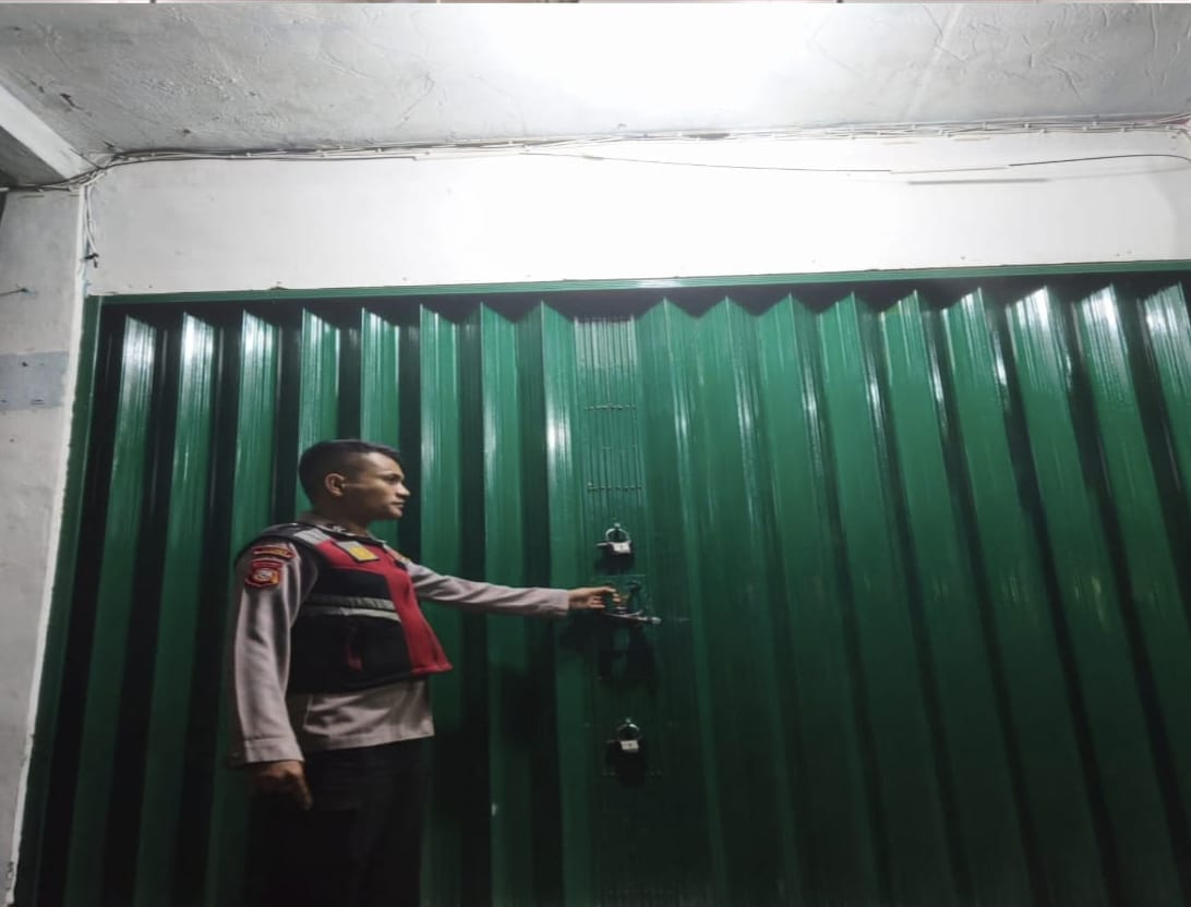 Karawang,bukaberita.co.id.- Sebuah pintu pertokoan dan kios yang ada di wilayah kampung Loji Kulon Desa Cintalaksana di periksa oleh personil Polsek Tegalwaru saat patroli malam. Selasa (24/3) malam hari tadi.