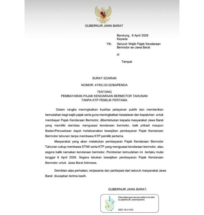 Jawa Barat, bukaberita.co.id – Kebijakan pembayaran pajak kendaraan bermotor di Jawa Barat kini mengalami perubahan. Terhitung mulai Senin, 6 April 2026, masyarakat tidak lagi wajib membawa atau menunjukkan KTP pemilik pertama maupun pemilik lama kendaraan saat membayar pajak tahunan.