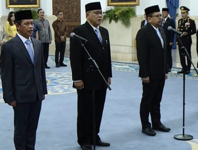 Jakarta, bukaberita.co.id – Presiden Prabowo Subianto melantik enam pejabat baru dalam rangka reshuffle Kabinet Merah Putih di Istana Negara, Senin (27/4). Dalam pelantikan tersebut, para pejabat terlebih dahulu mengucapkan sumpah jabatan untuk setia kepada Undang-Undang Dasar 1945 serta menjalankan peraturan perundang-undangan dengan penuh tanggung jawab. Mereka juga berkomitmen menjaga etika jabatan dan mengabdi kepada negara.