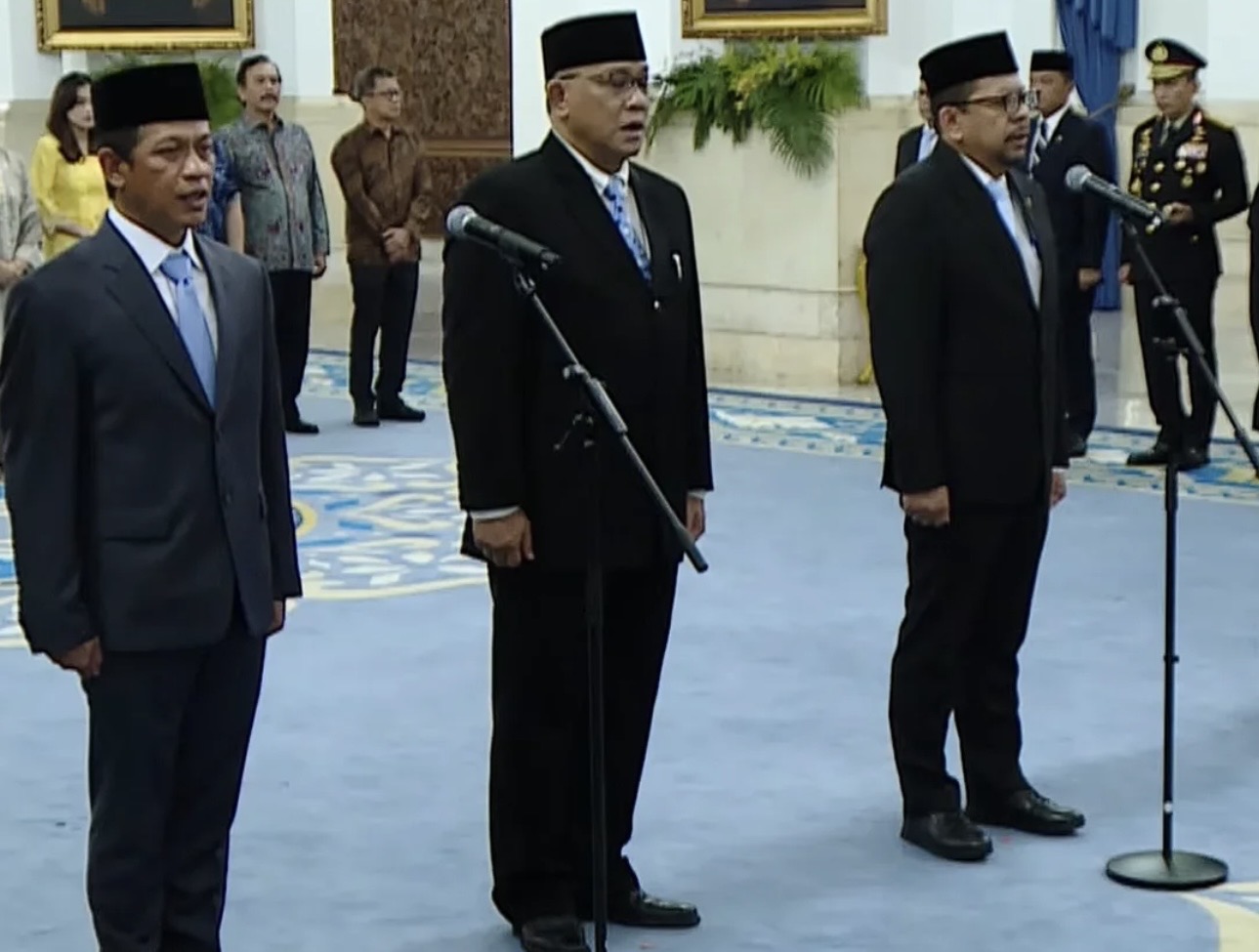 “Bersediakah saudara-saudara untuk diambil sumpah menurut agama Islam?” tanya Prabowo dalam prosesi pelantikan.