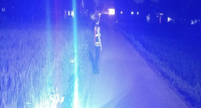 Personil Polsek Tegalwaru melaksanakan giat patroli malam di lokasi akses jalan sepi.